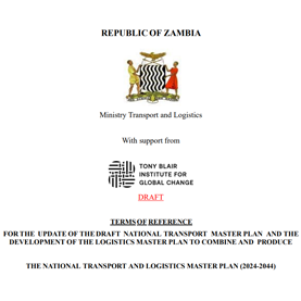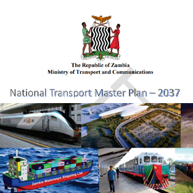 Transport-related Zambia masterplans and strategies Zambia Railways Limited: Strategic Business Plan 2024 – 2028 Published: September 2024 View Document TOR: Update of the Draft National Transport Masterplan and the Development of the Logistics Masterplan to Combine and Produce The National Transport and Logistics Master Plan (2024-2044) Published: April 2024 View Document Draft National Trade Logistics Strategy 2021-2030 2020 View Document Zambia National Transport Policy Published: May 2019 View Document The Border Management and Trade Facilitation Act No. 12 of 2018 Date of Assent: December 2018 View Document National Transport Master Plan – 2037 Published: January 2018 View Document